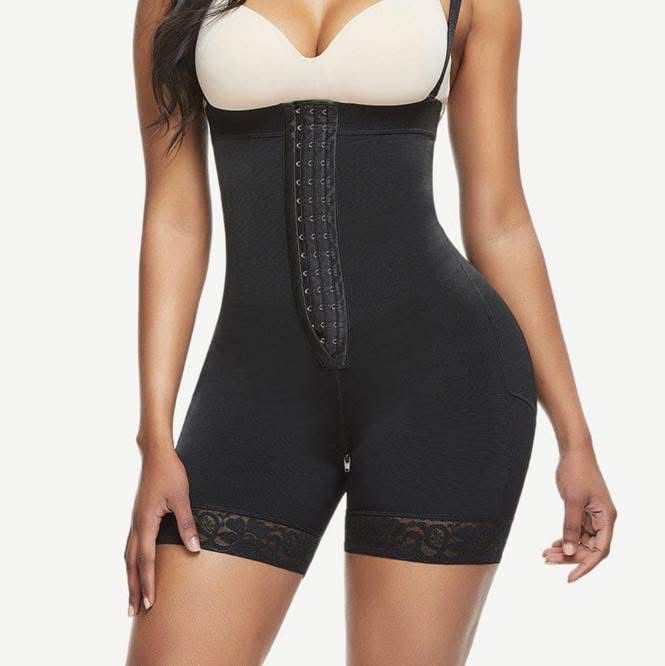Our Full Body Shaper is crafted for all-day comfort with high compression, utilizing a durable yet soft medical-grade, hypoallergenic fabric. It features three front clasps for easy adjustment and tightening, removable straps to secure the garment from rolling down, and an upright back design engineered to conceal back bulges. For maximum convenience, the shaper includes a mid-thigh short design and a secure zipper at the bottom for effortless bathroom use.